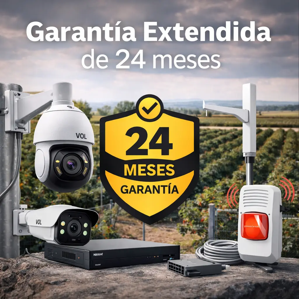 Esta cobertura incluye cámaras, grabadores, antenas, enlaces inalámbricos, sirenas, alarmas y redes, asegurando que tu sistema de seguridad se mantenga operativo y protegido en el tiempo. Porque en seguridad agrícola, la continuidad y la confianza marcan la diferencia.
